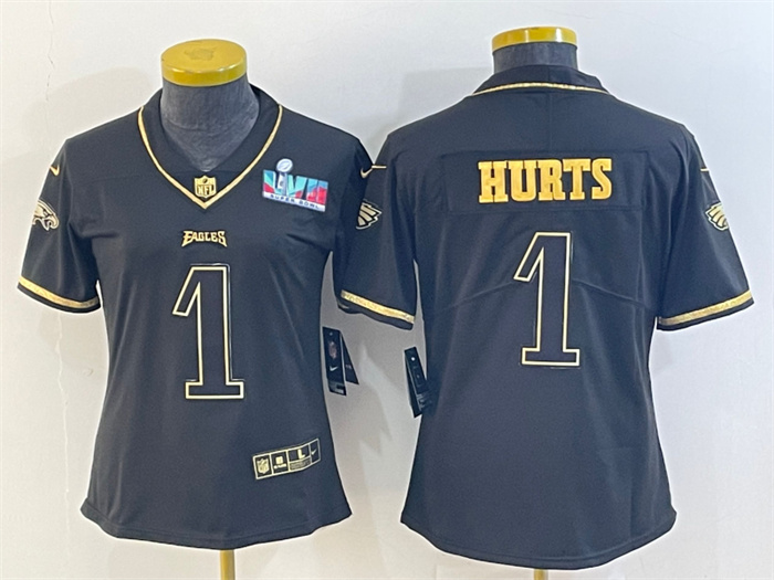 Women Philadelphia Eagles 1 Jalen Hurts Black Golden Edition Super Bowl LVII Patch Stitched Football Jersey