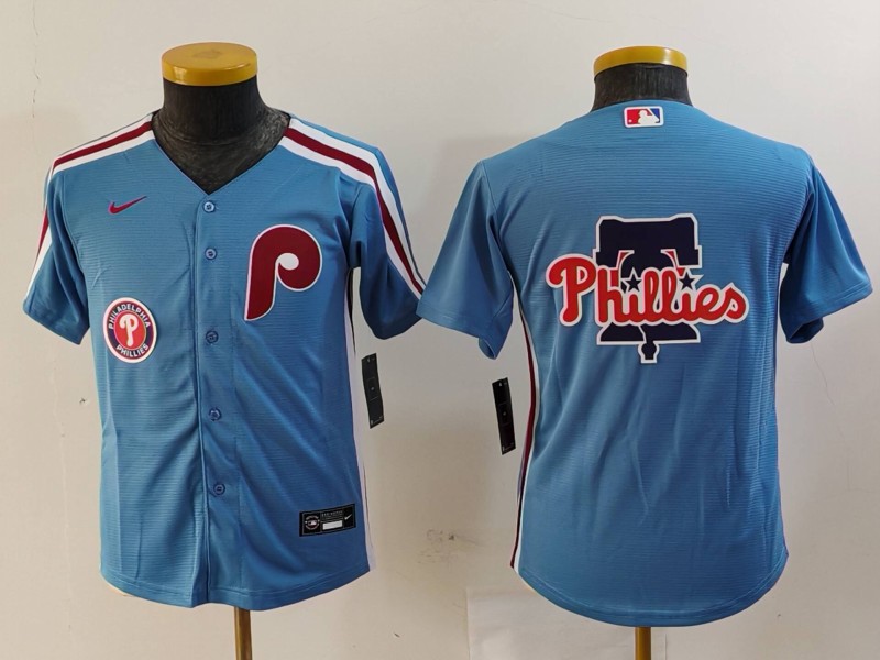 - Youth Philadelphia Phillies Team Big Logo Blue Cool Base Stitched Baseball Jersey 1